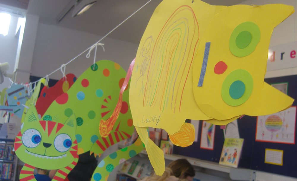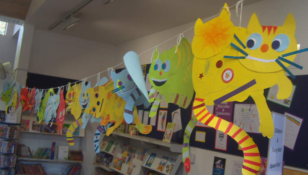 Last week I was joined by children in Witham, Basildon and Maldon libraries where we made scores of Cheshire Cats. Being naturally solitary creatures, Cheshire Cats have rarely, if ever been seen in these kinds of numbers before, making this half-term a record-breaking Wonderland phenomenon! Last week’s “Down the Rabbit Hole” workshops in Essex Libraries were supported using public funding by the National Lottery through Arts Council England and I’d like to say a huge thank you too to all the wonderful librarians and volunteers who assisted with the collage cat creation. There is still one workshop to go so if your children come along to Saffron Walden Library on the 14th November they can make their very own Cheshire Cat to add to the score!