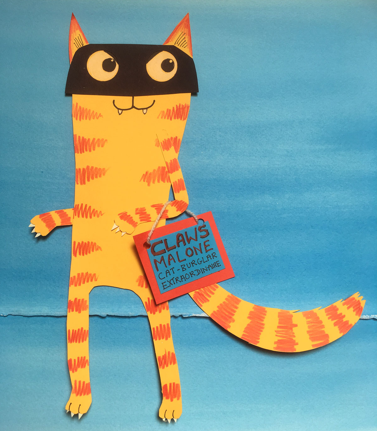 Saturday saw the 6th annual St Ives Book Jam and I was there doing collage and drawing for the 6th time! It was another very splendid day which was as well attended by authors, illustrators and book-loving children as it always is. I helped create a huge mural curated by wonderful illustrator and author Pam Smy based on the theme of Heroes and Villains. In the afternoon I worked with the lovely and talented author-illustrators Trudi Esberger and Carolina Rabei to help children create villains, superhero masks and superhero emblems. I took charge of the villains of course; check out cat burglar Claws Malone, the dreadful Salamander of Doom and last but not least the infamous bank robber Bad Giraffe…