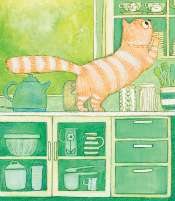 I have been a bit quiet on the posting front for a while but I’m back now with a detail from a book I’m working on at the moment. It’s still early days so I won’t say very much other than… it’s about cats! Who would have thought? Here is a little sneak-peak of my lovely green 70s kitchen!