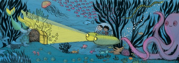 After helping create the underwater themed mural with children at the St Ives Bookjam recently, I decided to make my own underwater picture! It started life as a simple black and white ink drawing which I then scanned and coloured in photoshop. It’s unusual for me to work in the computer as I usually like to slosh as much paint around as I can, but it just seemed like the best way to do those beams of light…