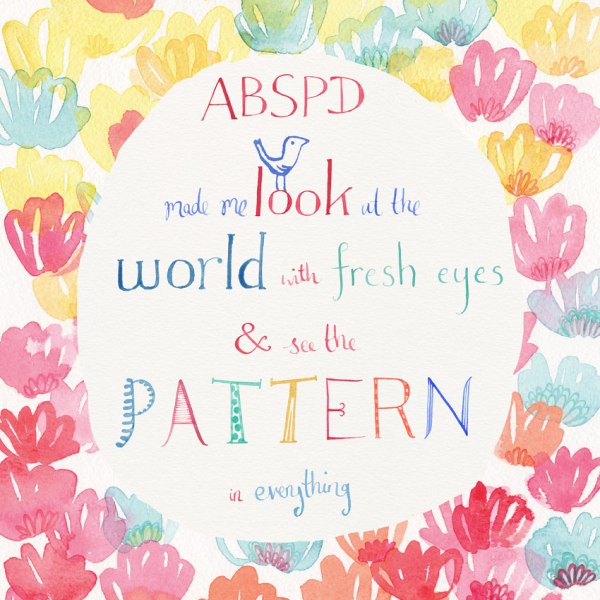 I am absolutely thrilled to bits that my entry to the Make it in Design testimonials competition has won me a place on the next part of the course! My picture was created with water colour and I used a dip pen for the fine lettering. I loved doing the first module in the Art and Business of Surface Pattern Design course and it really has changed the way I look at the world, so it felt right to use bright spring colours to express that. My testimonial was one of two to have been chosen by course leader and design guru Rachael Taylor and fellow winner was Kevin Brackley who is no doubt feeling every bit as chuffed as I am!